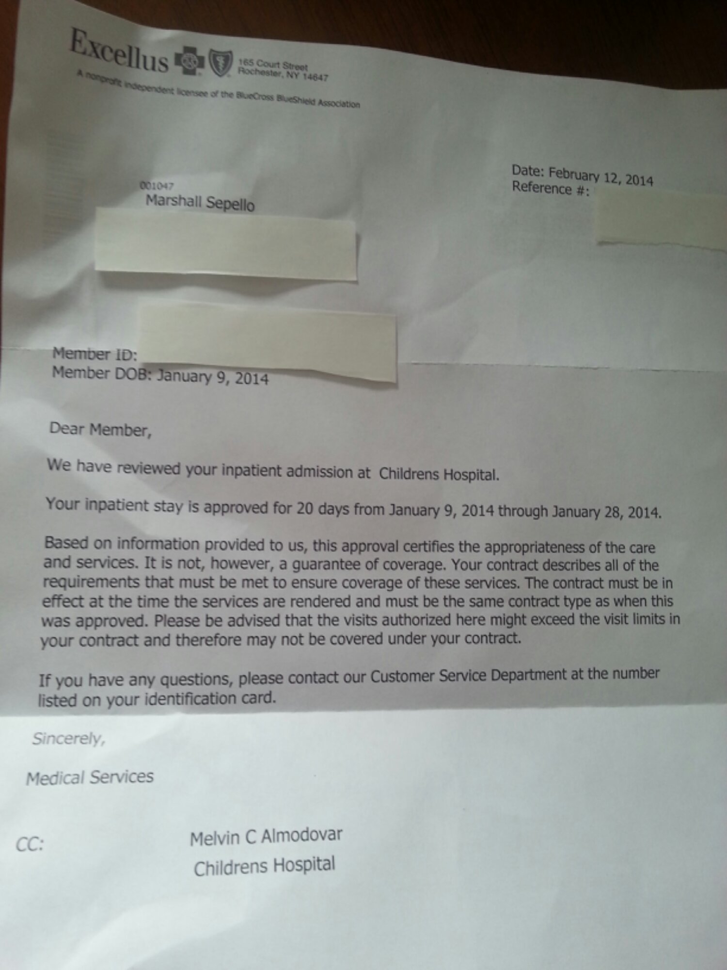 I have four boys to raise, clothe, shelter, and feed in this crazy world. And one day of Marshall’s care at Boston was around $5,100. This letter obviously shows our insurance didn’t cover his last day of care there.